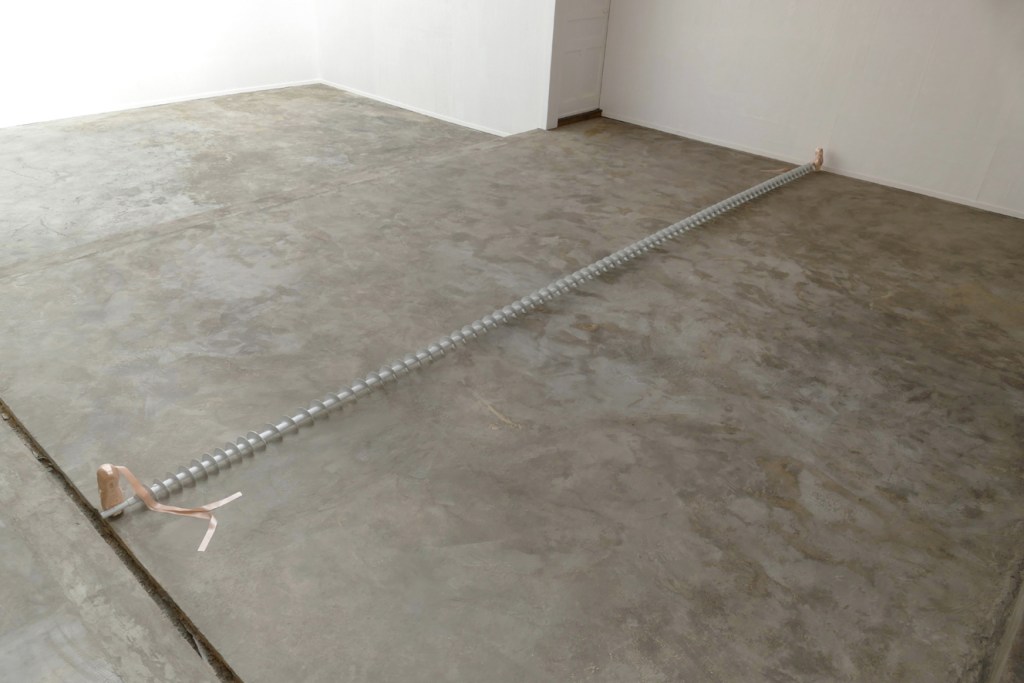 ‘Walking On Light’ – 2019. fluorescent light tubes, rubber boots, plexiglass, pigmented coating. dimensions variable ( ~35 x 255 x 180 cm).