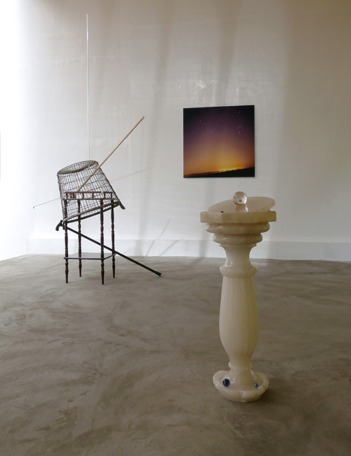 ‘Chreode’- 2019. white marble, marbles, crystal ball 50 mm. 67 x 27 x 23,5 cm. Background: ‘With The Bravery of Being Out Of Range [Passage #2]’ – 2017. star maps mounted on board, perforated glass, frame. 48 x 107,5 cm.