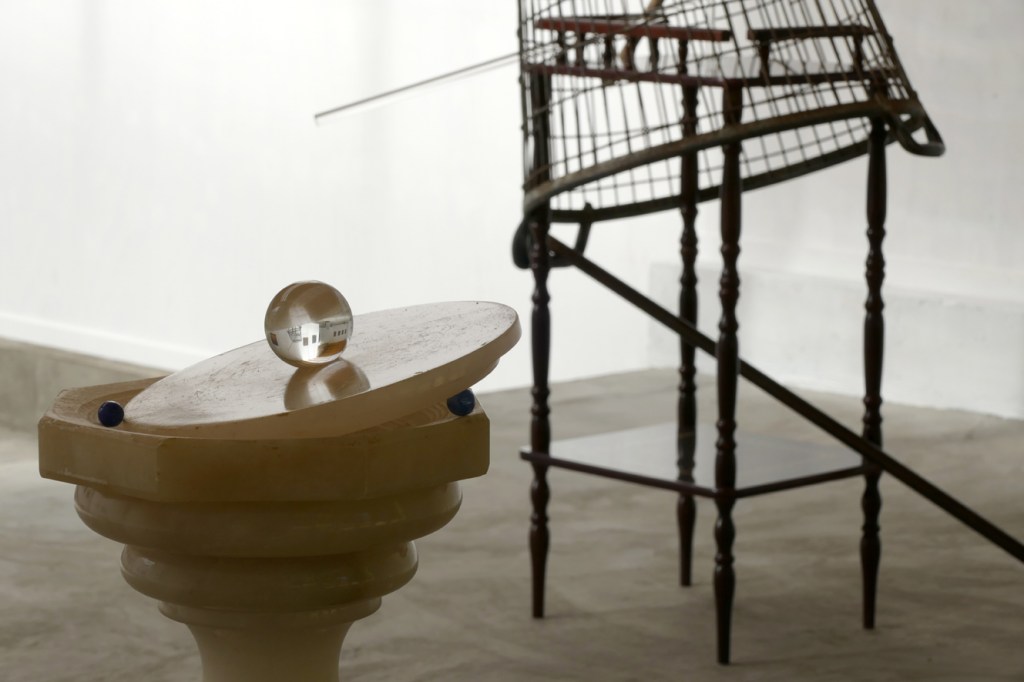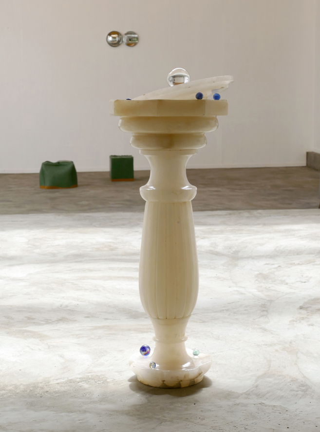 Foreground: ‘Chreode’- 2019. white marble, marbles, crystal ball 50 mm. 67 x 27 x 23,5 cm.