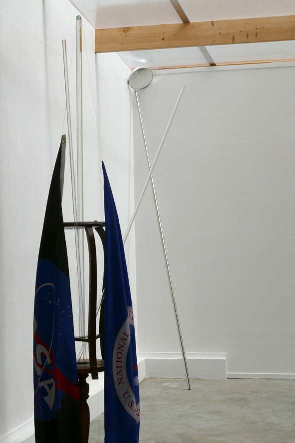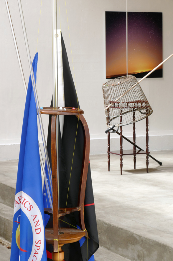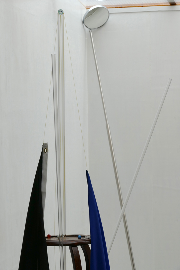 La Conquête d’Espace [Icarus]’ – 2019. flags, wood, glass, marbles, yellow fishermans rope. 224 x 103 x ~50 cm. Background: ‘Sterrenklok’ – 2019.