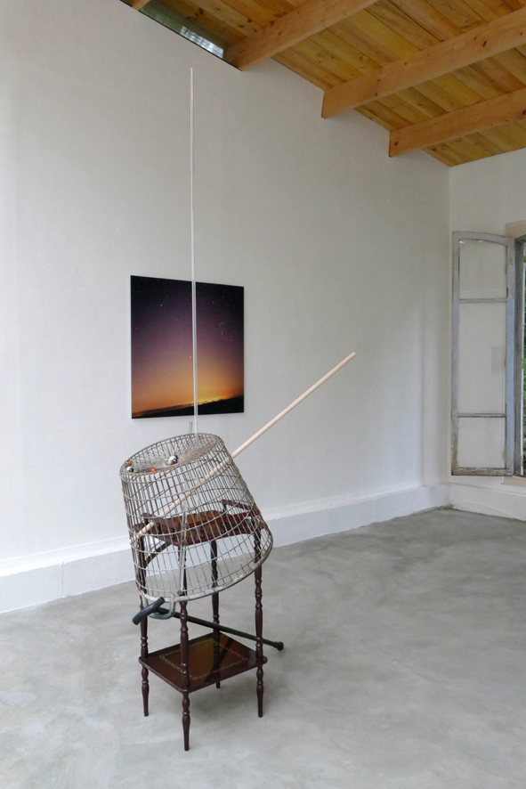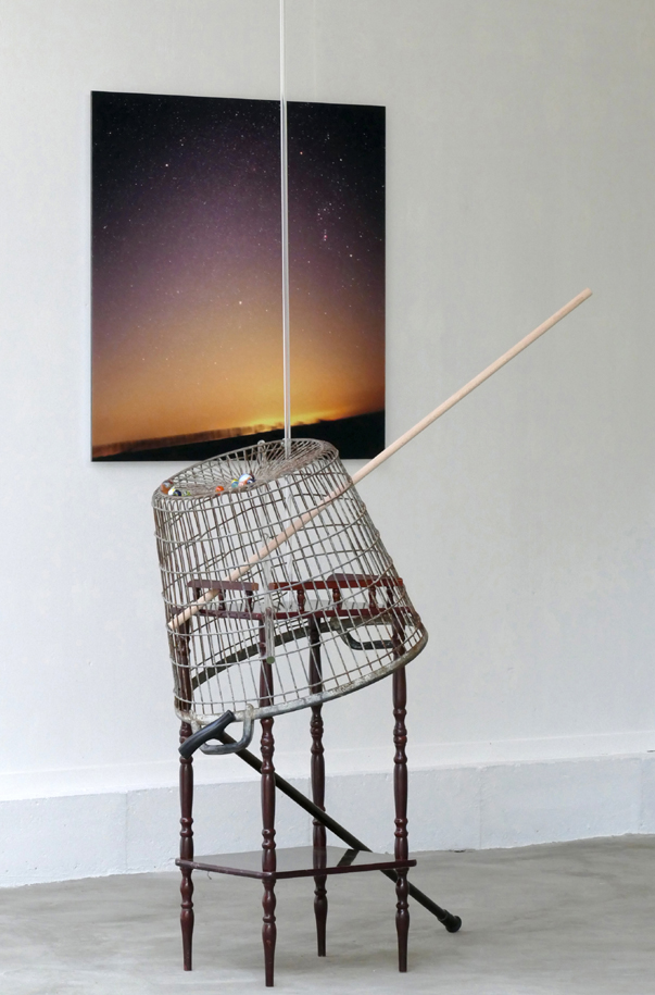‘Sterrenklok’ [Star Clock] – 2019. metal, wood, glass, marbles, walking stick, 215 x 116 x 87 cm. Background: ‘Osiris-O’Sirius’ – 2004. pigment irisprint on Photo Rag on dibond, 80 x 80 cm.