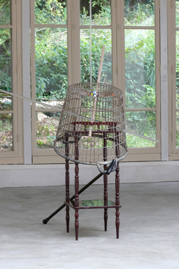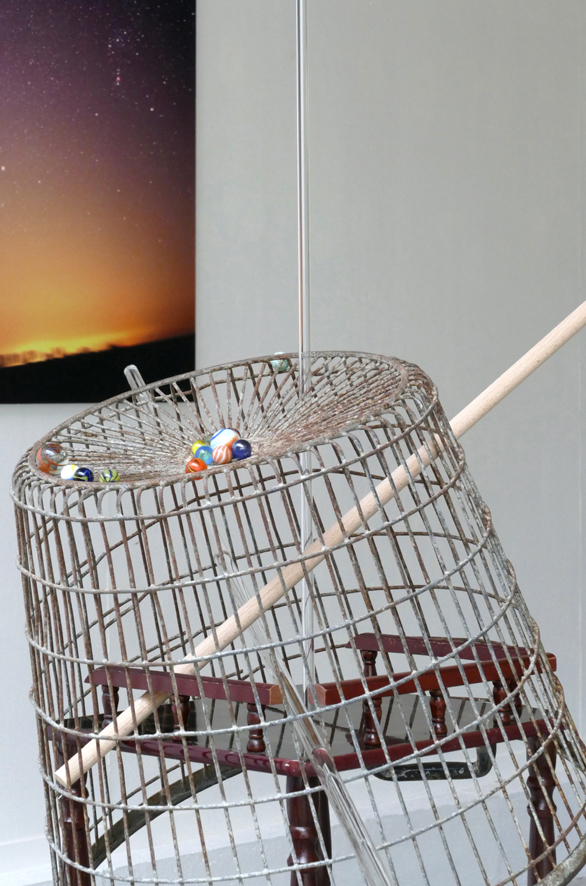 ‘Sterrenklok’ [Star Clock] – 2019. metal, wood, glass, marbles, walking stick, 215 x 116 x 87 cm.