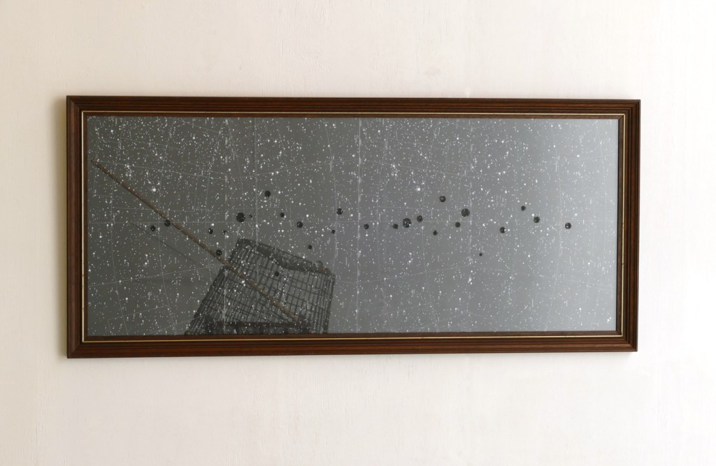 ‘With The Bravery of Being Out Of Range [Passage #2]’ – 2017. star maps mounted on board, perforated glass, frame. 48 x 107,5 cm.