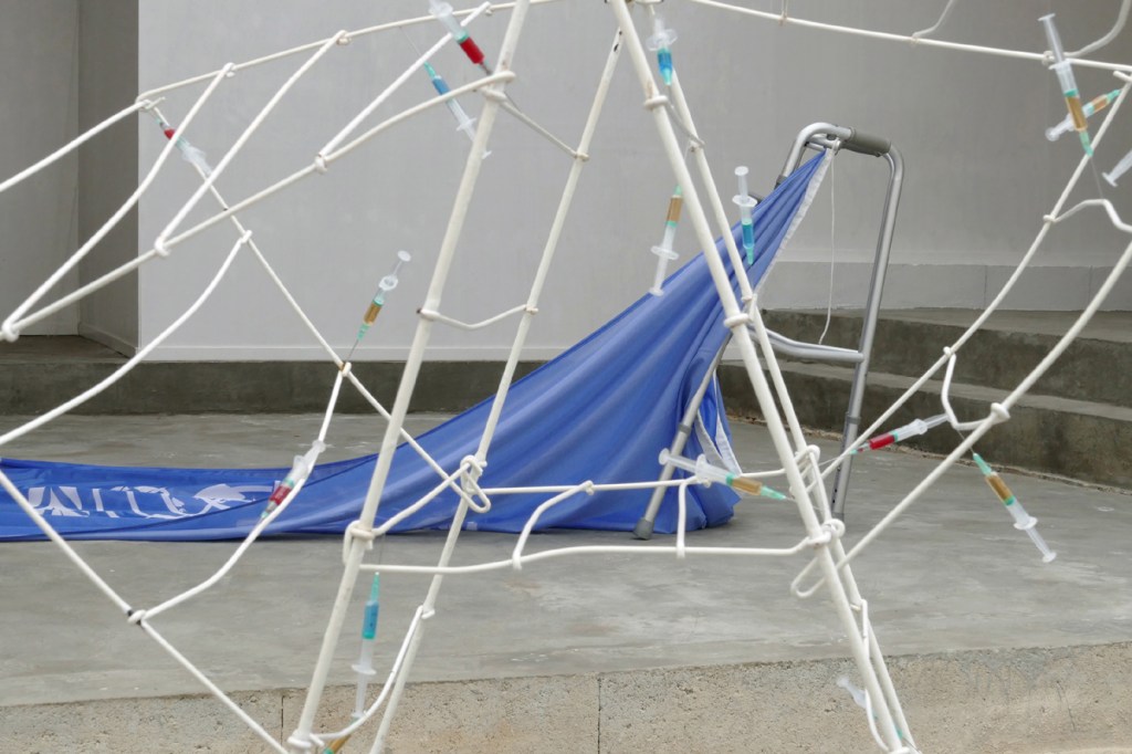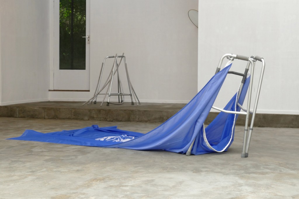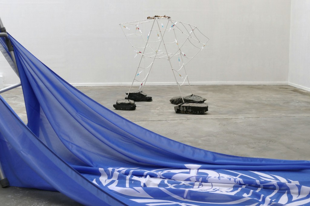 ‘Tabernacle’ [Corona Triomphalis -III] – 2020. aluminium, flag World Health Organisation. 93 x 285 x 175 cm. Background: ‘Confession’ – 2020 & ‘La Distantiation Sociale’ (1) – 2020.