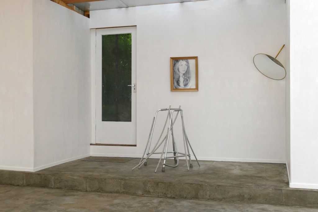 ‘Tautology’ [Corona Triomphalis -1] – 2020. aluminium. Background: ‘The Light In Your Eyes’ [Fatima] -2008-2020. print on Photo Rag, gilded frame, glass. 57,5 x 47,3 x 3 cm. On the right: ‘Narayana is everywhere’ – 1995. convex mirror, messing, diameter 56 cm.