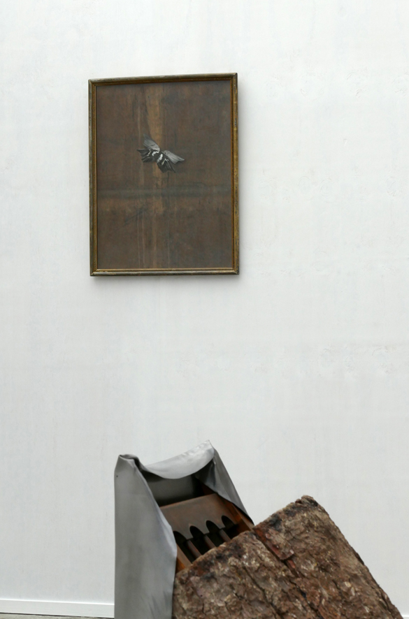 ‘Confession’ [Biecht] – 2020. wood, lead. 71,5 x 49 x 70 cm. Background: ‘Secretos Di Mi Alma #1’ – 2017. star maps and poppy petals mounted on board, glass, frame. 71,7 x 56,6 cm. &: ‘Nachtvlinder’ – 2019.