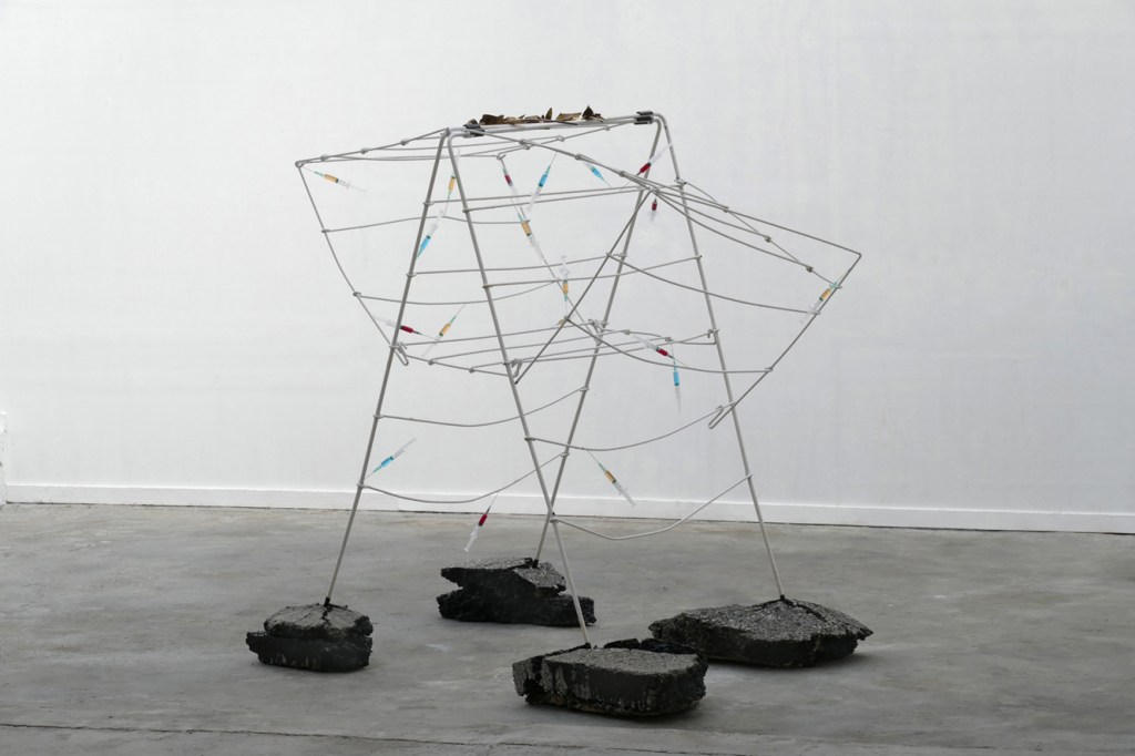 De constructie waaraan men normaliter zijn klederen (identiteit) te drogen hangt, zakt hier onmiskenbaar door z’n