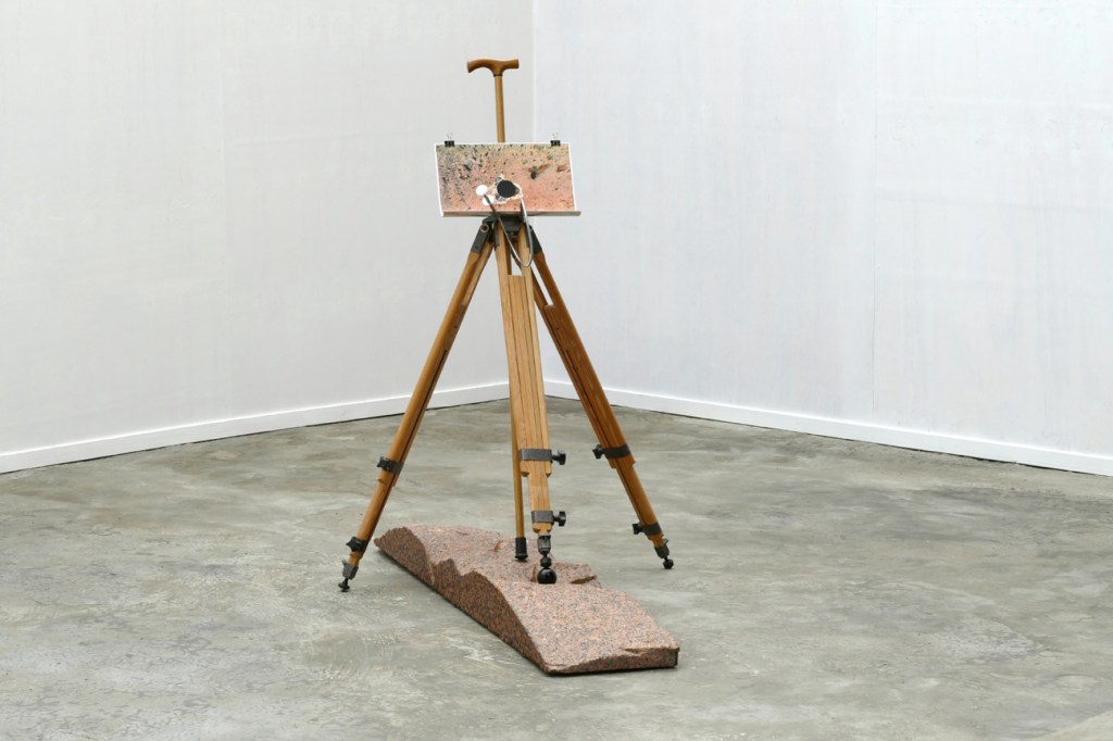 ‘Terra di Marte’ – 2019-2020. granite rose, wood, marble, clipboard with NASA photo composite of Martial surface taken on landing site by Pathfinder. Sizes: 109 h x 134 x 75 cm. Background: ‘Telescopic projection of solar light image on a sheet of paper held up by the artist’ – 1996. c-print, aluminium, push-pins, 91 x 62 cm.