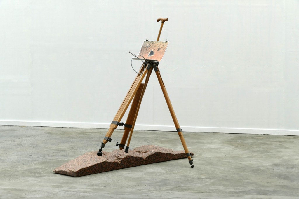 ‘Terra di marte’ en ‘Planetoïde’ verwijzen beiden expliciet naar de – zeer actuele – exploitatie van de planeet mars. Het granit rose is als een soort ‘lokaal’ substituut gekozen voor wat nog het meest op fragmenten van een marslandschap zou kunnen lijken. De wijze waarop de poten van het statief zijn ‘neergeplant’ zou reminiscenties op kunnen roepen met een (landings)toestel. De handgreep bovenaan de centrale as (in feite een wandelstok) plant zich als een soort boor in het rijkelijk met gaten doorpriemde gesteente. Bovenop bevindt zich een clipboard met een foto gemaakt door de marsprobe pathfinder. Dit fotocomposiet toont het omringende marslandschap in 360o, weliswaar in een gebruikelijk ‘aangepast’ kleurengamma, maar hier interesseert ons primair de afwezigheid van ‘zelfreflectie’, zoals deze zichtbaar is geworden in de vorm van de zwarte cirkel in het midden. De blinde vlek. Een camera kan nooit zichzelf fotograferen, het oog zichzelf niet ‘zien’. Wat is het überhaupt dat het oog doet zien, zo kan men zich tevens afvragen? De eenzijdig naar buiten gerichte blik, is een onjuiste perceptie van de werkelijkheid, gebaseerd op een subject-object denken van het illusoire ego en kan gemakkelijk leiden tot een grenzeloze exploitatie van alles wat het meent zich te mogen toe-eigenen. Het was de diamantair en oprichter van het illustere geheim genootschap The Round Table (1891), Cecil Rhodes, die al heel lang geleden verklaarde: ‘If I could, I would annex the planets’.