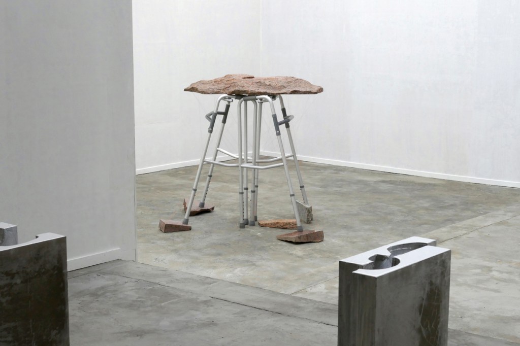 ‘Planetoïde’ – 2020. granite, rose granite, aluminium, fishermen’s rope. 108 x 91 x 152 cm. Foreground: ‘La Distantiation Sociale I & II – 2020. cement, resin. two parts each.