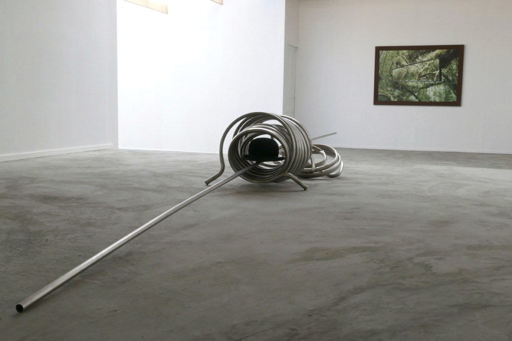 ‘Prometheus (I)’ – 2020. inox, felt, 44 x 70 x 515 cm. Background: ‘Rear View Mirror Jungle [Eye Level Piece]’ – 2018. print on aluminium, dibond, wooden frame, 116,5 x 166,5 cm.
