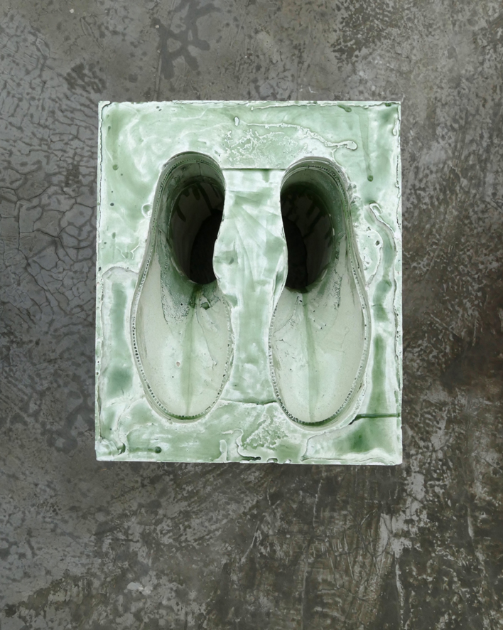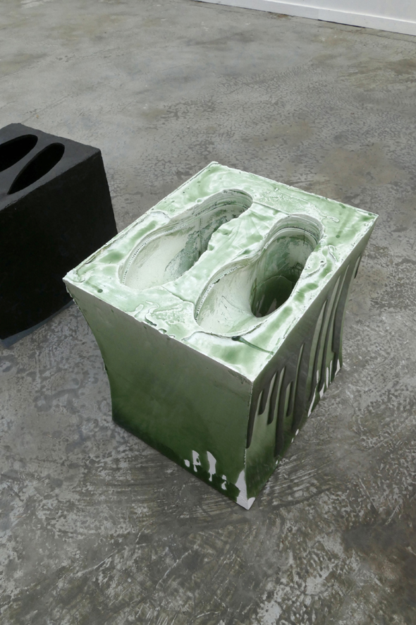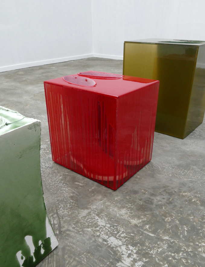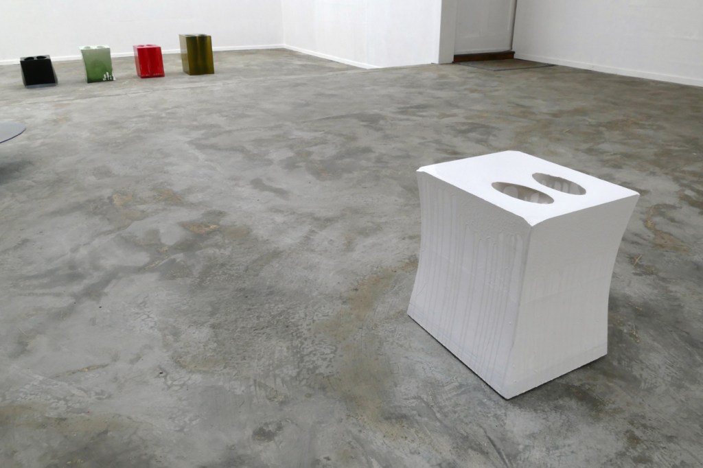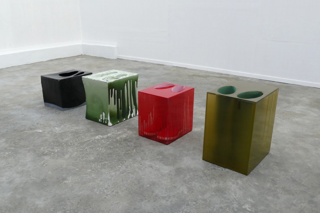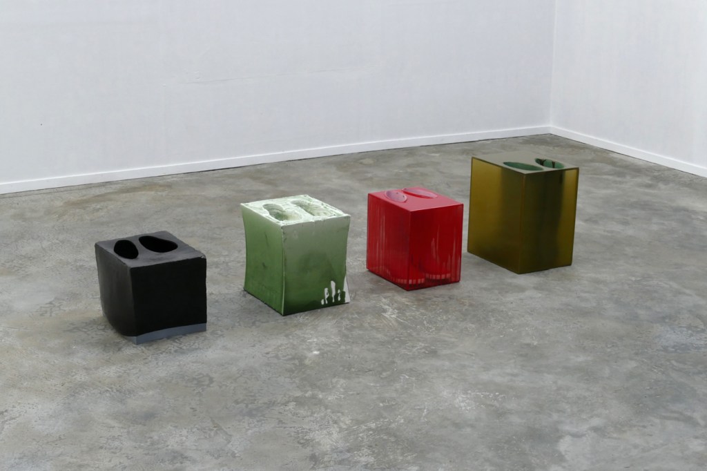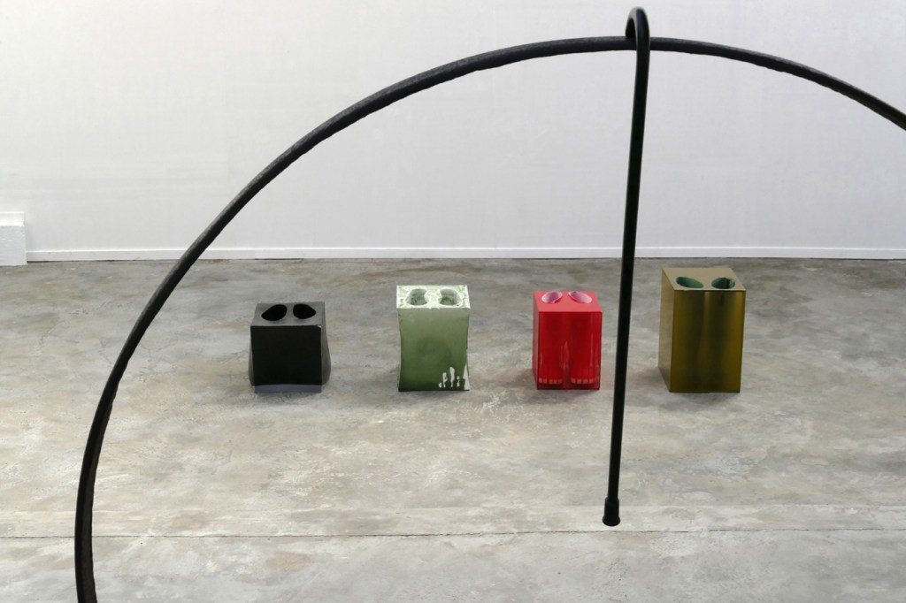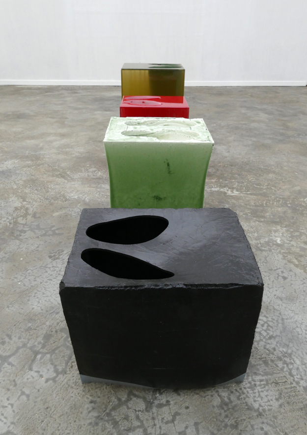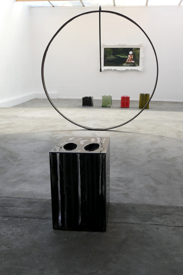 Foreground: ‘Atopos’(VIII) – 2020. rubber, plexi glass, resin, pigment.