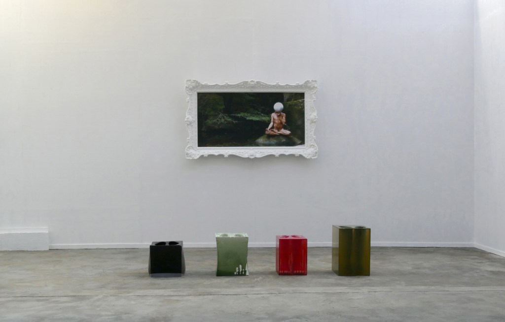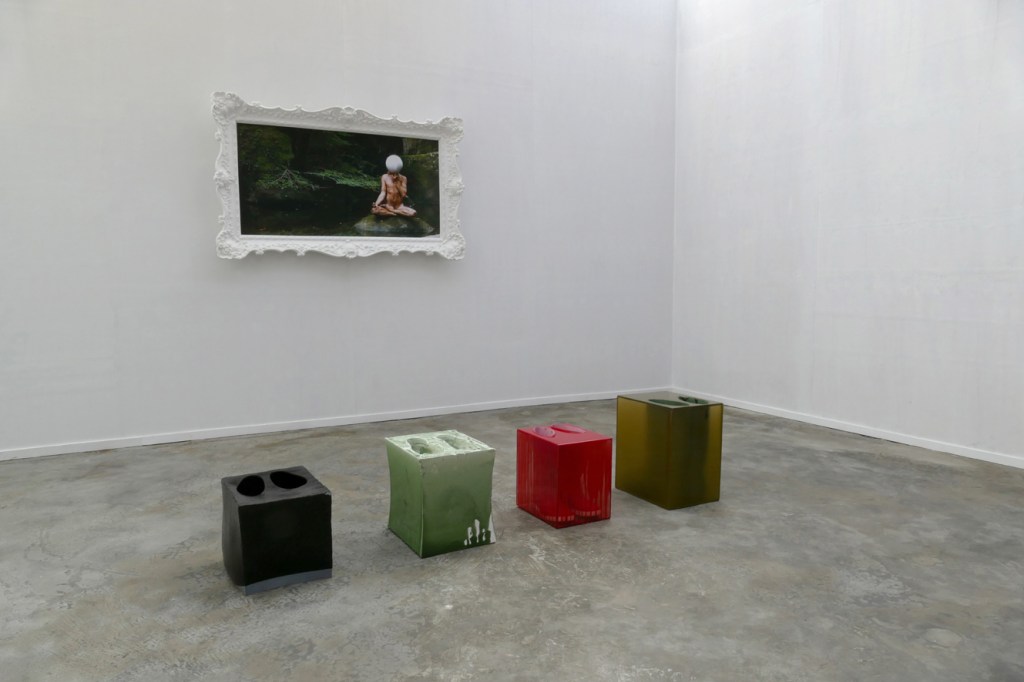 ‘Chymische Hochzeit’ [Nigredo-Purgatio-Destillatio-Regeneratio] – 2020. (privat coll. Sneek) 4 parts. rubber, resin, pigment, silicone rubber, PU-rubber, plexi glass, plaster. 39 x 33½ x 180 cm. Background: ‘Insula Deï’ – 2008. c-print on aluminium, frame, 86 x 144 cm.