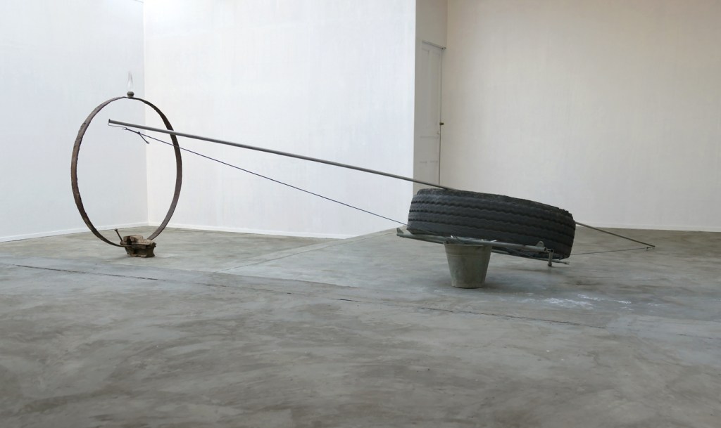 Foreground: ‘L’espace n’est pas localisable [Torsion]’ – 2021-2022. galvanised steel, inox, marbles. 46½ x 100 x 100 cm.