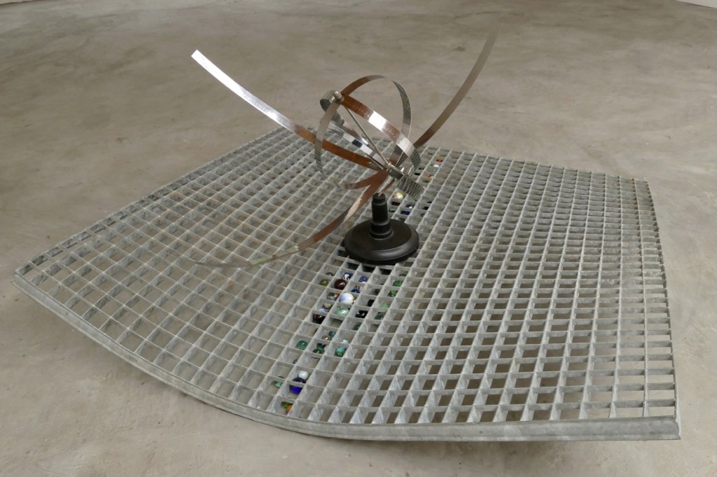 ‘L’espace n’est pas localisable [Torsion]’ – 2021-2022. galvanised steel, inox, marbles. 46½ x 100 x 100 cm.