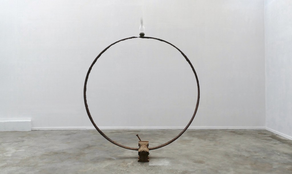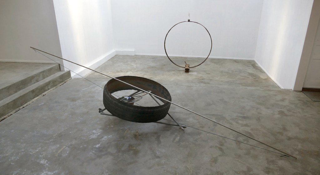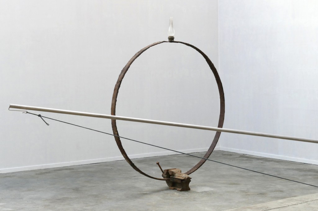 Left: ‘The End Of The Aion’ – 2021. steel, glass. 172 x 142 x 29 cm. Right: ‘De Ring van Tot Niet Verder [Zodiak]’ – 2021. galvanised steel, inox, rubber, glass, marbles, rope. 98 x 124 x 500 cm.