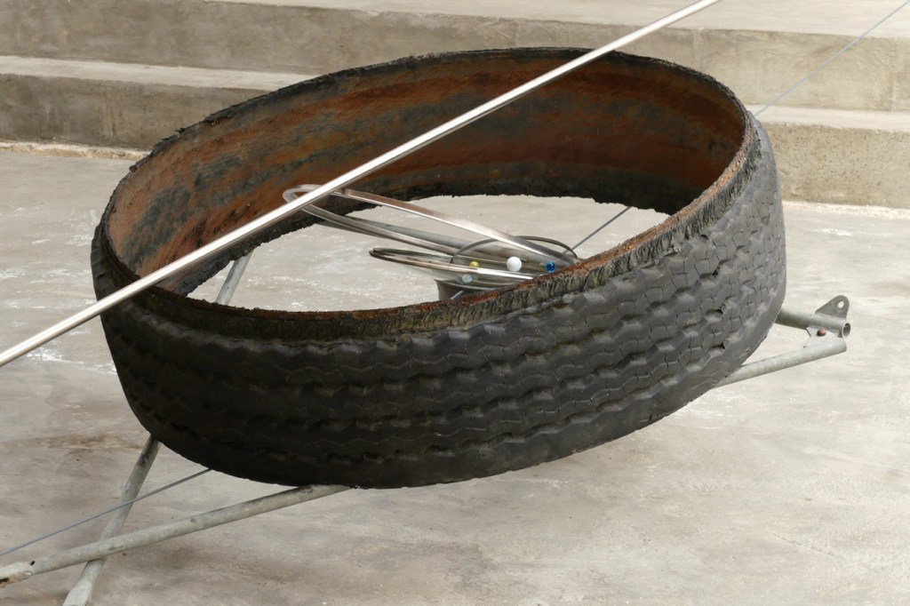 ‘De Ring van Tot Niet Verder [Zodiak]’ – 2021. detail. galvanised steel, inox, rubber, glass, marbles, rope. 98 x 124 x 500 cm.