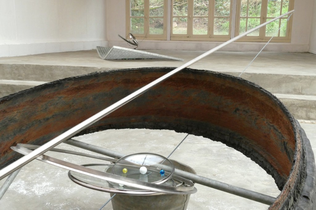 Foreground: ‘De Ring van Tot Niet Verder [Zodiak]’ – 2021. galvanised steel, inox, rubber, glass, marbles, rope. Background: ‘The End Of The Aion’ – 2021. steel, glass.