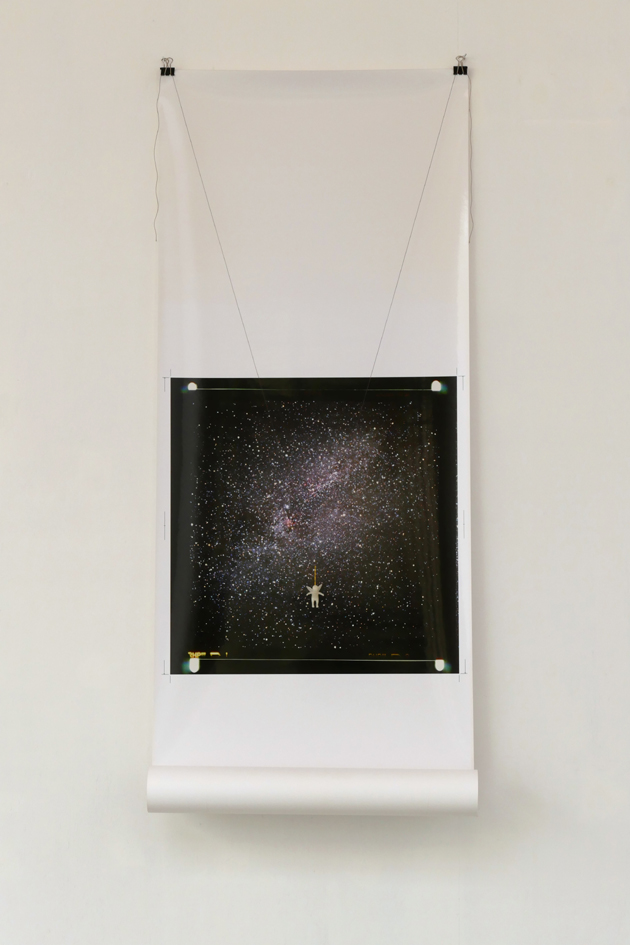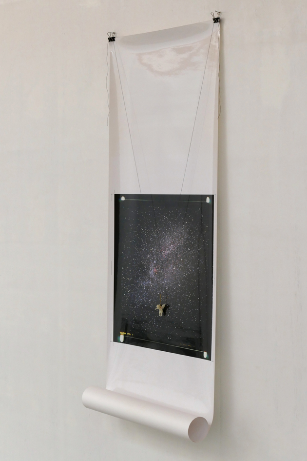 ‘Er Is Geen Dag, Er Is Geen Nacht’ – 2022. print on roll photopaper of celestiel sky (Cygnus) with small plastic object. ~125 x 43 x 8 cm.
