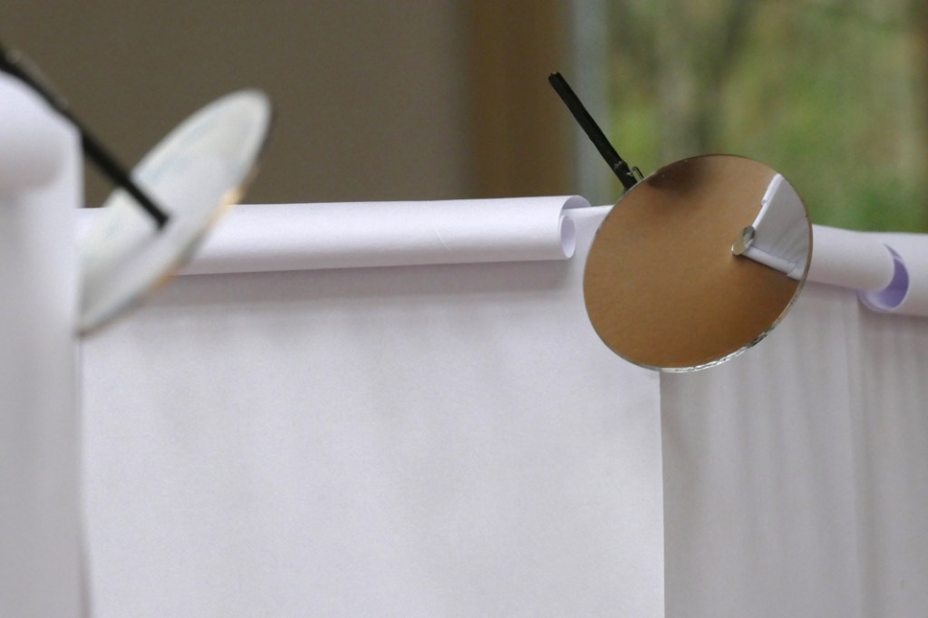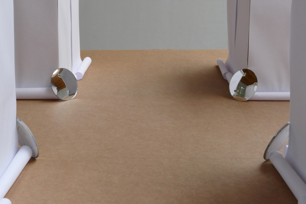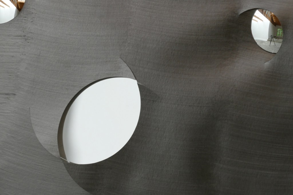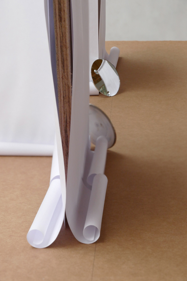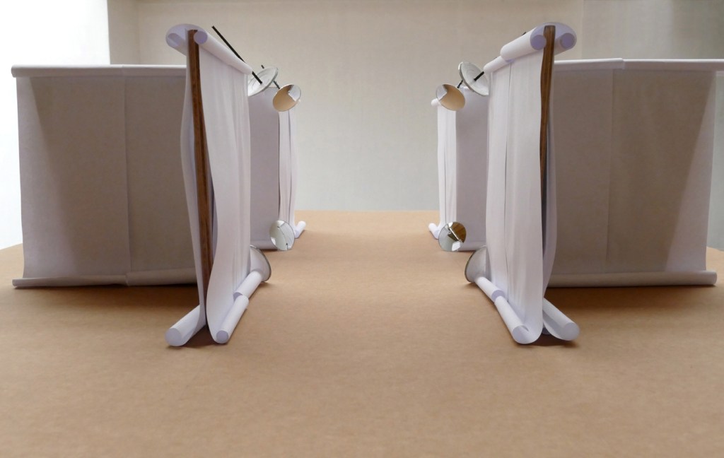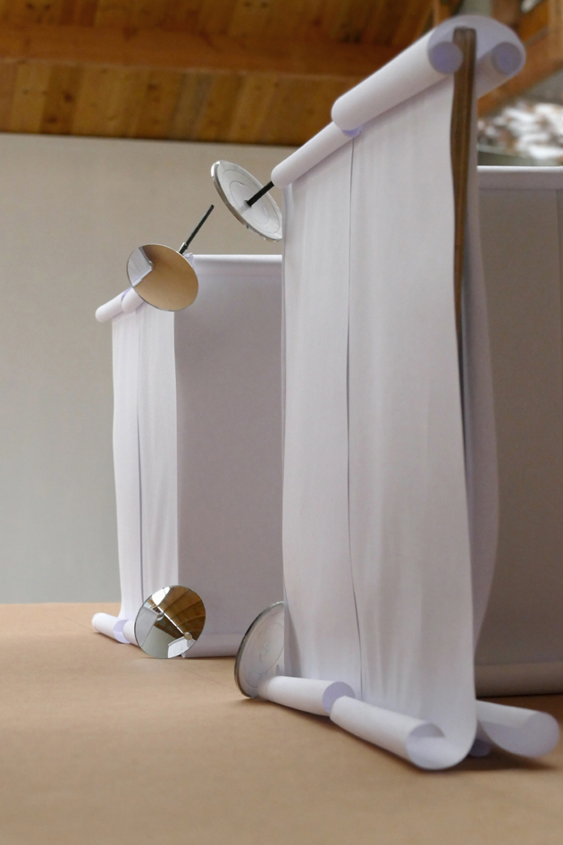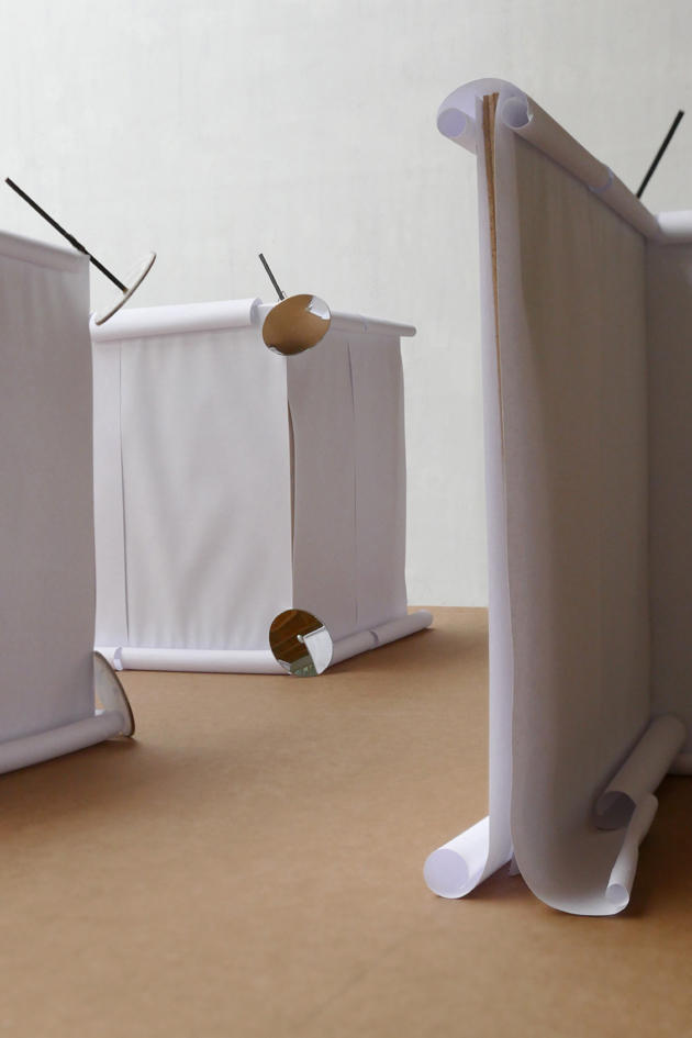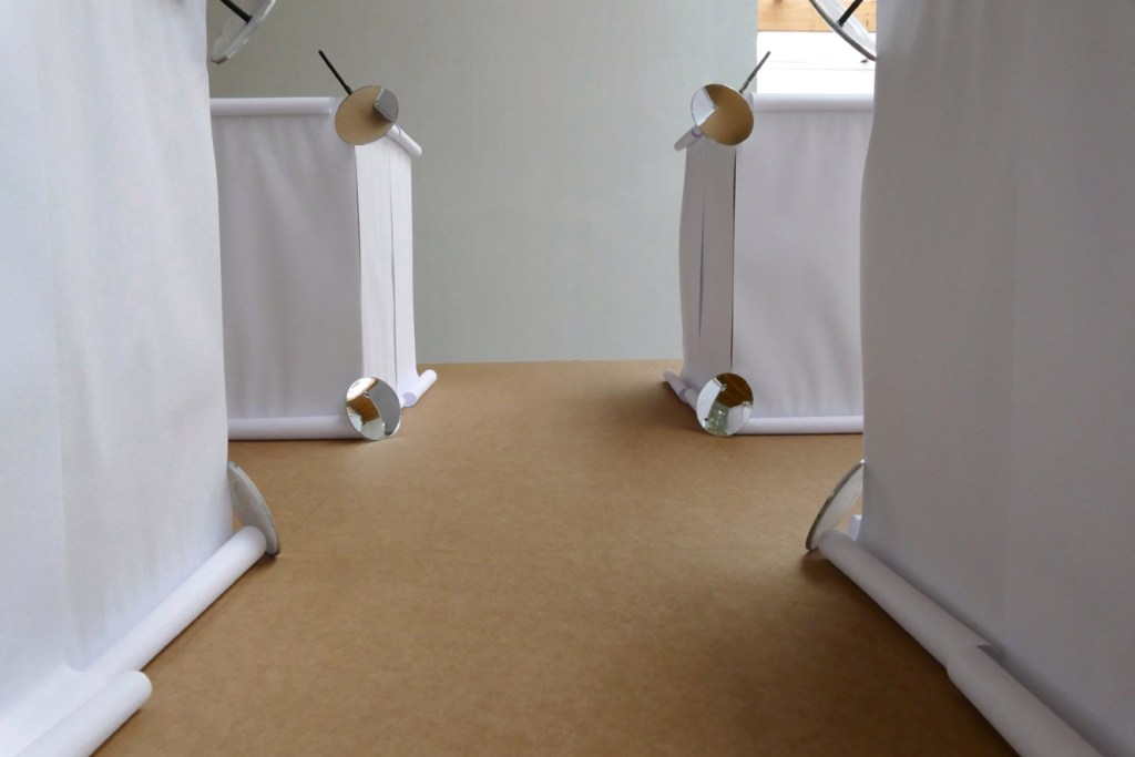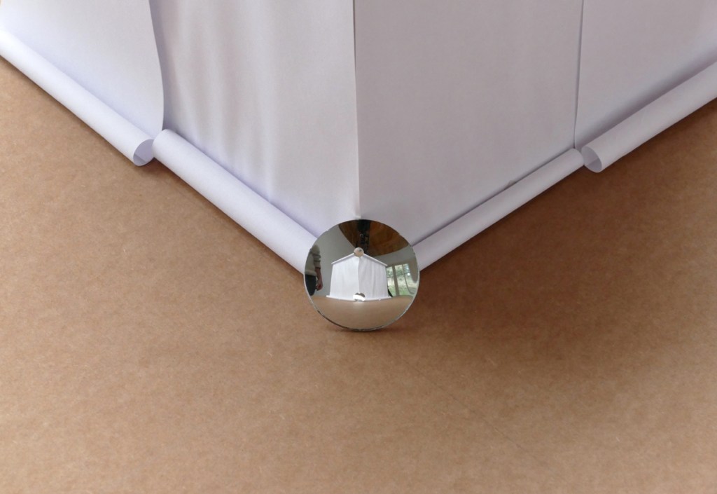 ‘Paviljoen van de Geest’ [‘Pavillon de l’Esprit‘] – 2022. Model for sculpture 1:12. convex mirrors, paper, wood. real sizes: mirrors Ø 60 cm, paper walls 300 cm high x 930 cm x 930 cm.