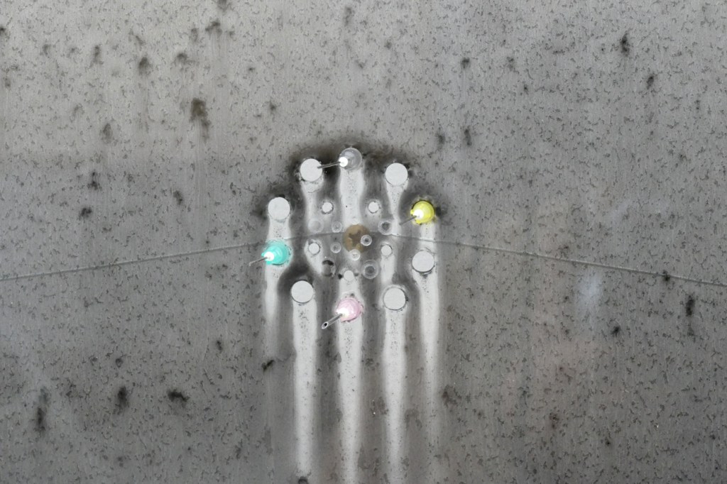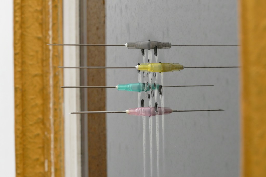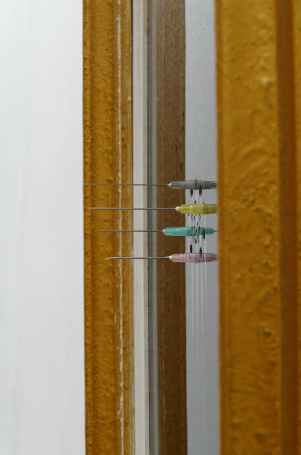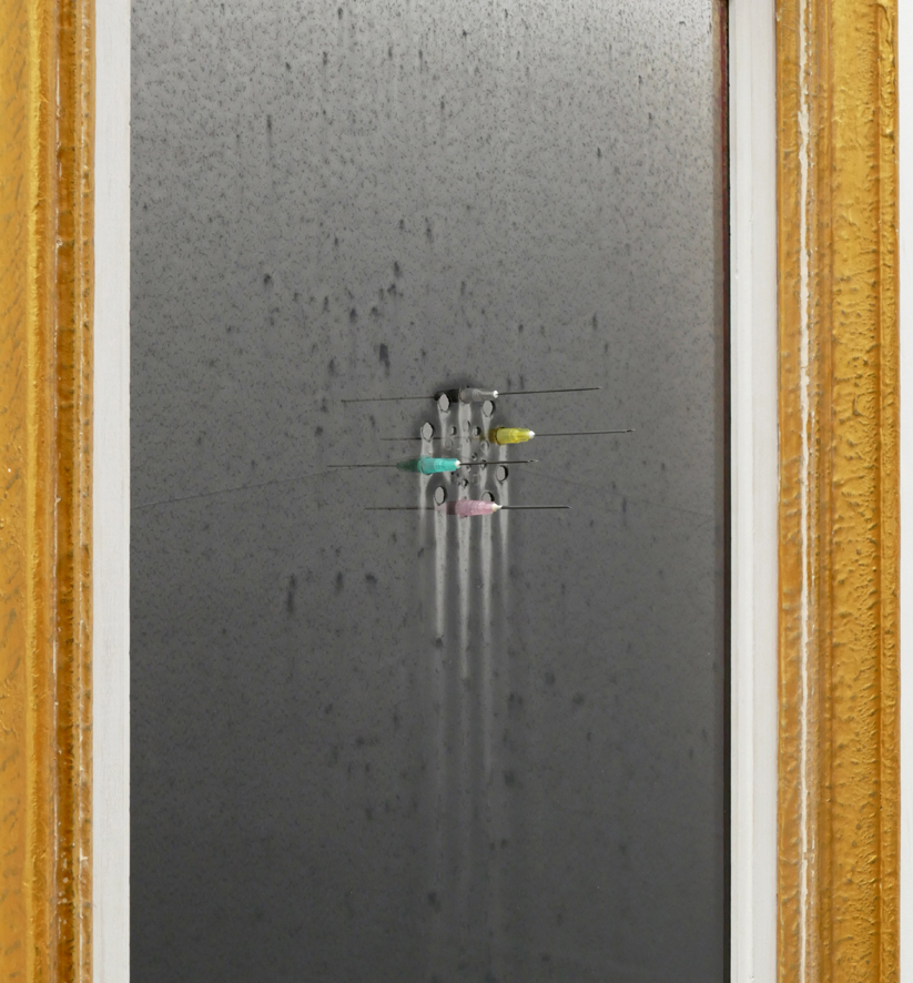 ‘Human Genome Project’ – 2019-2022. detail, perforated float glass, resin, pigment, injection needles, frame. 64,3 x 46,7 x 7,5 cm.