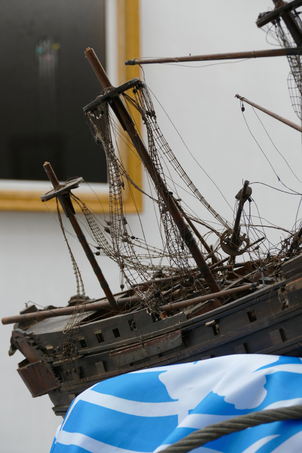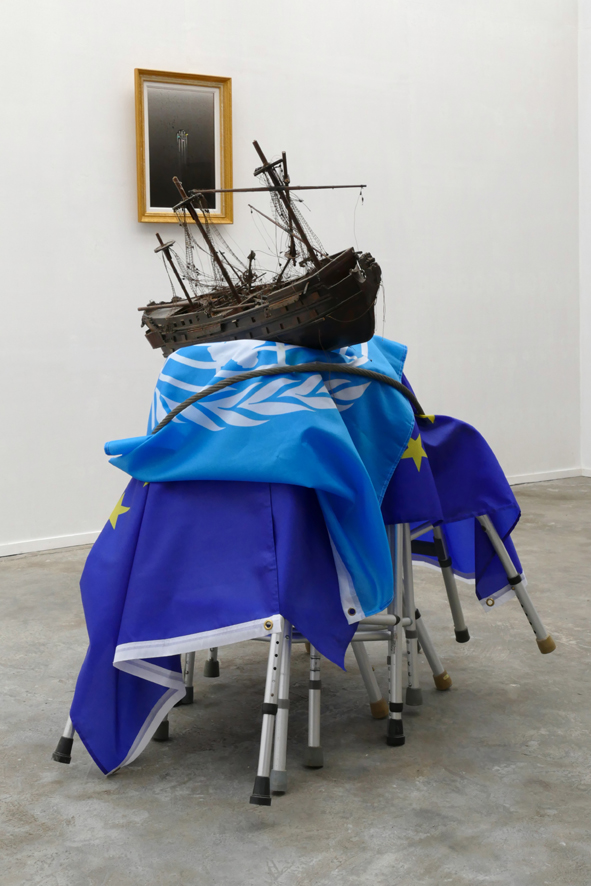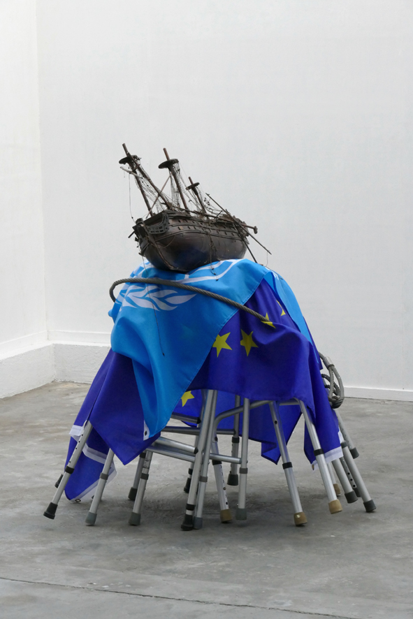 ‘The Rape of Europa (2)’ – 2022. wood, cloth (flags), aluminium, steel rope. ~130 x 117 x 90 cm.
