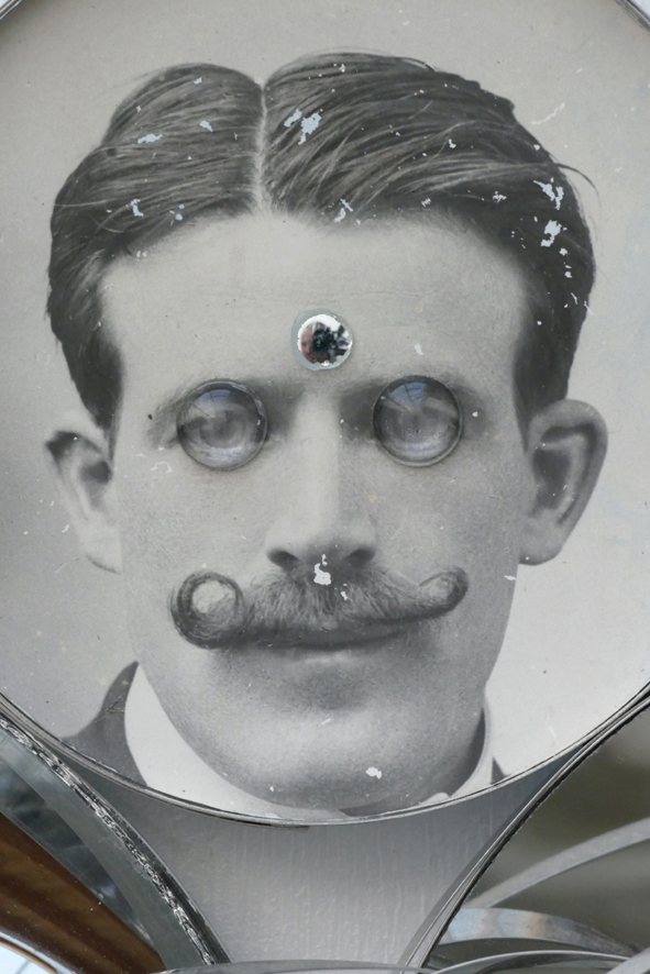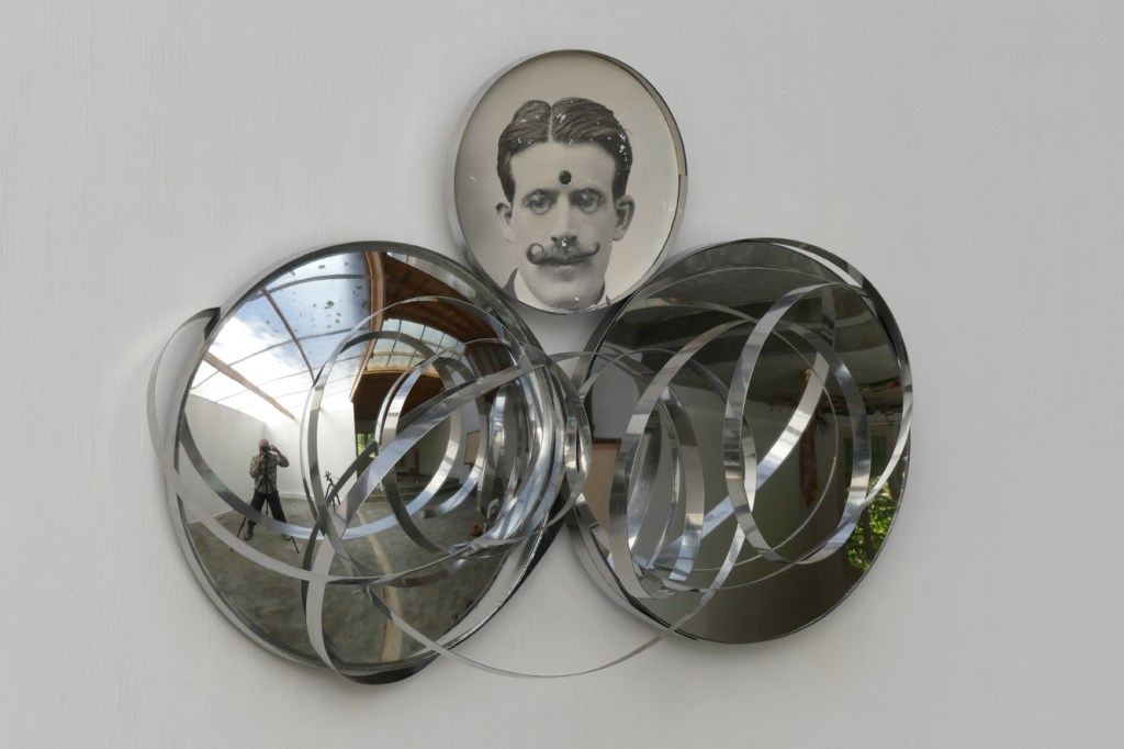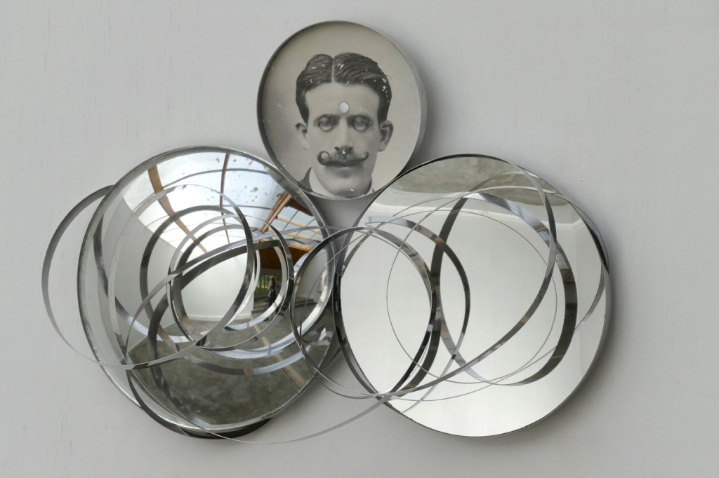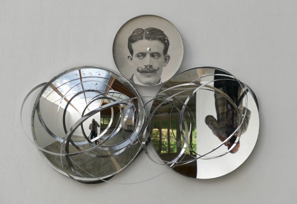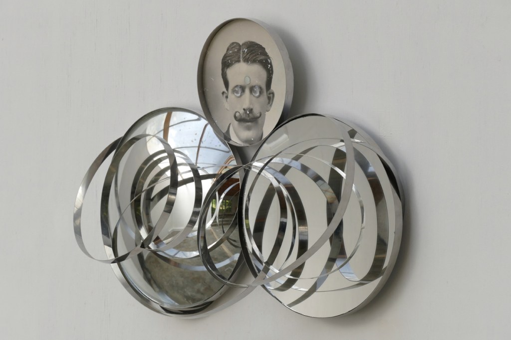‘The Science Deception (Reality is Non Linear)’ – 2022. antique photograph, convex and concave mirror, inox. 29 x 41 x 9 cm.