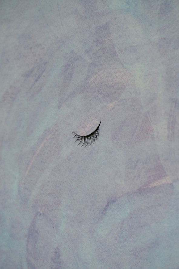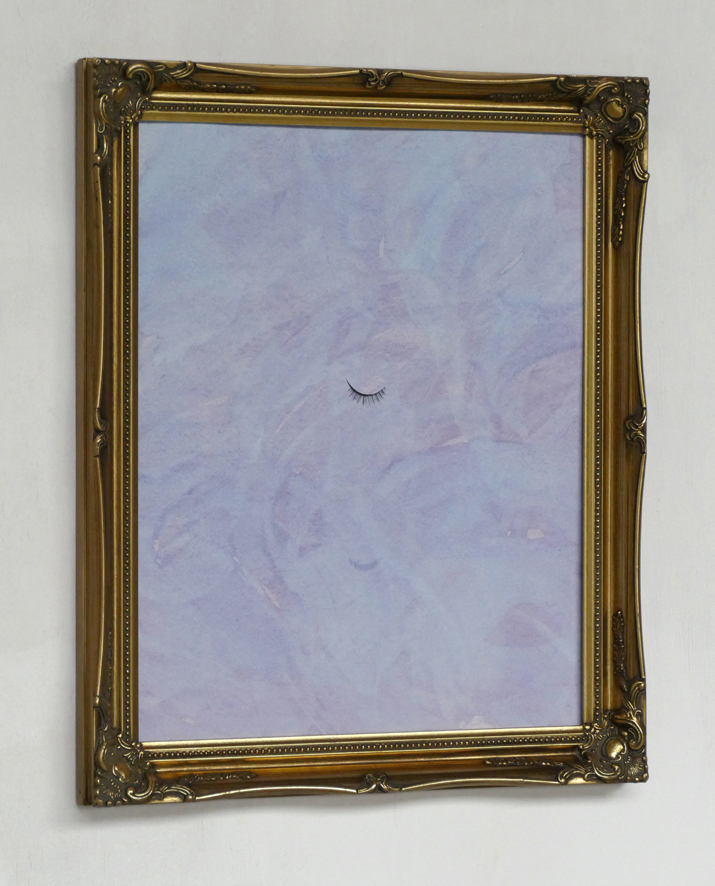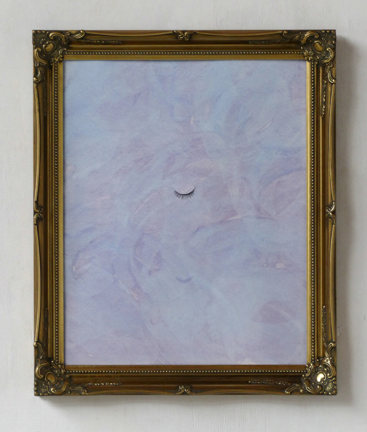 ‘Fear for Freedom’- 2022. aquarelle, cosmetic eyelash, float glass, frame. 59,3 x 49,2 x 4,2 cm.