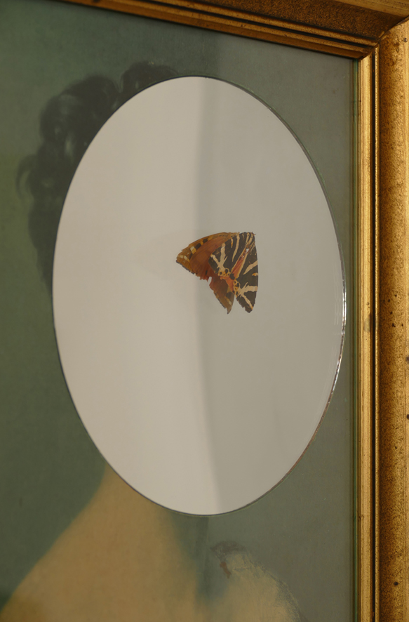 ‘Simulacrum (3) – Reality is Just Appearances’ – 2022. reproduction, concave mirror, butterfly, float glass, frame. 51,2 x 34,8 x 2,5 cm.