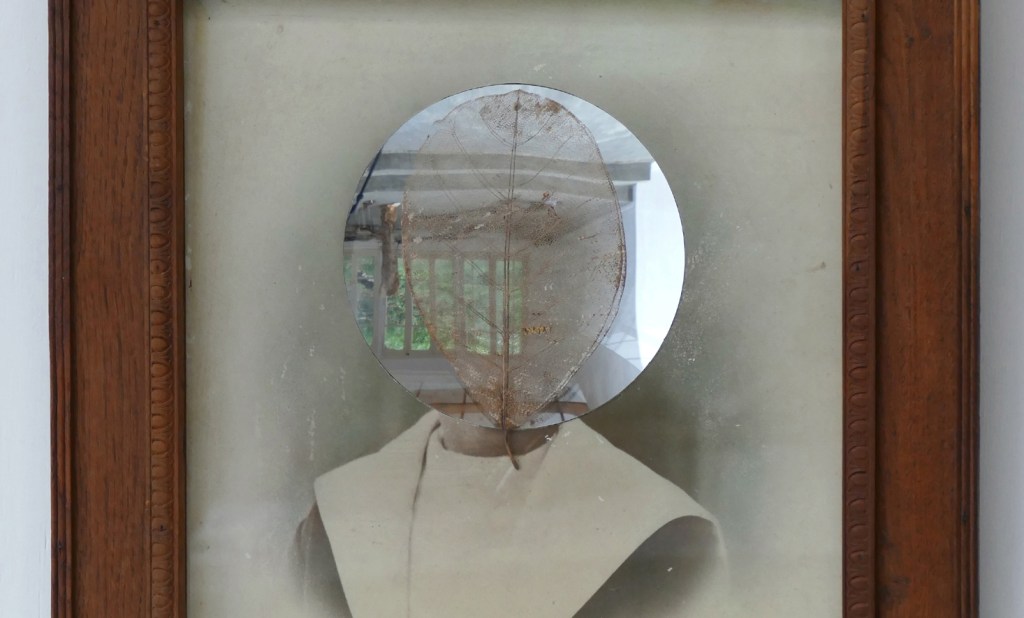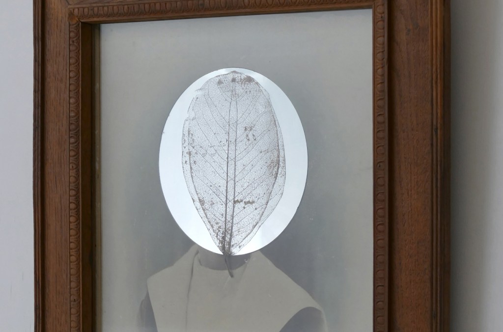 ‘Simulacrum (4) – Ieder blad is heel het woud en heel het woud is ieder blad. Ook ieder blad is ieder ander blad’ – 2022. antique photograph, concave mirror, leaf, float glass, frame, 58,5 x 51,3 x 4 cm.