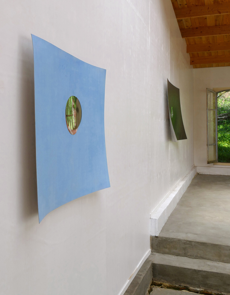 Foglia – I & 2’ [Leaf/Feuille -I &2] – 2023. pigment print on hahnemühle, gouache on paper on aluminium, semi mirrored concave glasses. Sizes: 80 x 80 x 8,5 cm/ graphite on paper on aluminium, 90 x 120 x 18,5 cm.