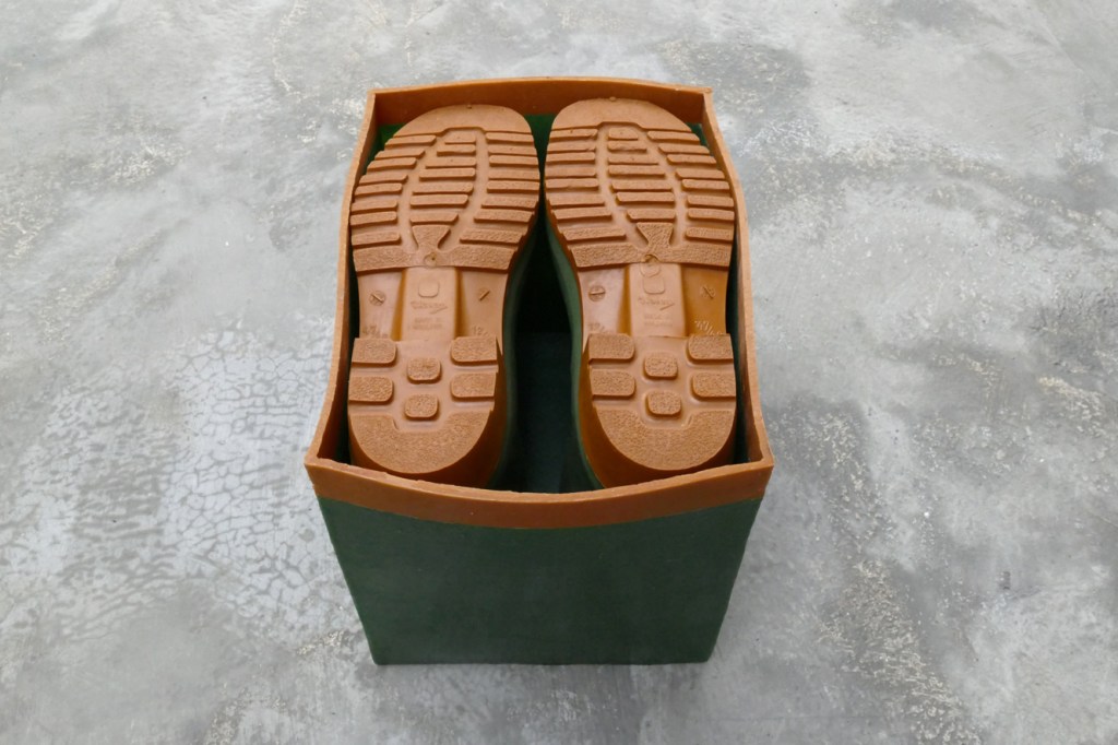 Het is om deze reden dat ik de laarzen – in hun verwijzing naar onszelf en naar de (natuurlijke) wereld waarin wij zijn – als centraal motief opvoer. Door ze binnen hun eigen afmetingen op te sluiten keren de laarzen zich af van elk mogelijk gebruik. De substantie heeft zich uitgebreid tot het formaat van hun ruimtelijke coördinaten. Zij vormen omhulsel en object tegelijk.