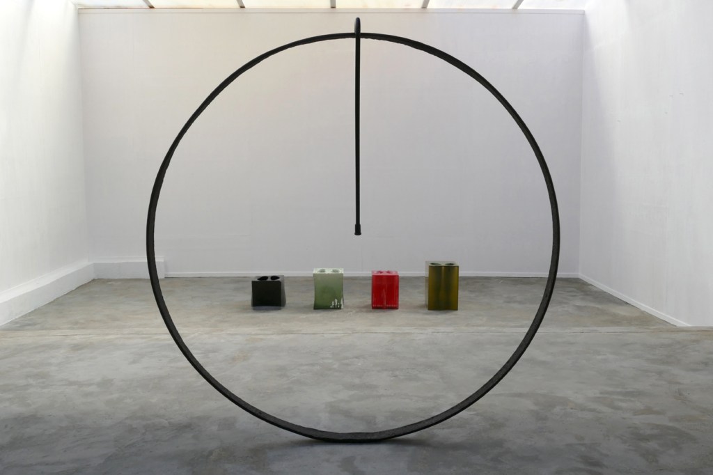 Alle sculpturen in deze tentoonstelling vertonen een ambivalentie ten opzichte van een omhoog- en omlaaggaand krachtenveld. Zwaarte paart zich aan lichtheid: lichtgewicht buizen aan doorhangende elektriciteitskabels, visdraad aan graniet, vilt aan massief staal. Objecten lopen in elkaar door: looprek koppelt zich aan armleuning, armleuning aan wandelstok, wandelstok aan bolhoed, als een logische sequentie samenhangende evenementen.