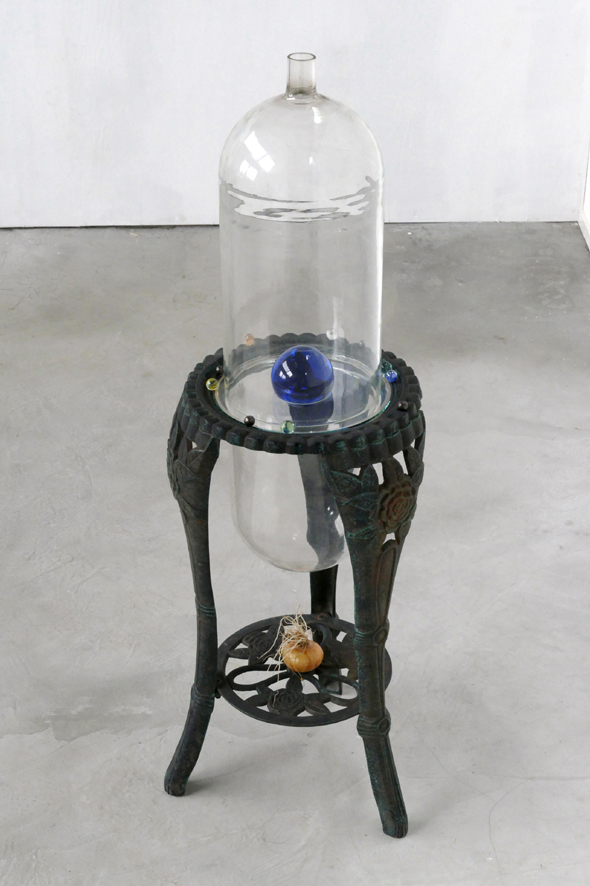 ‘Retort [Socle du Monde]’ – 2019. cast iron, glass, marbles, dried onion. 105 x 36 cm.